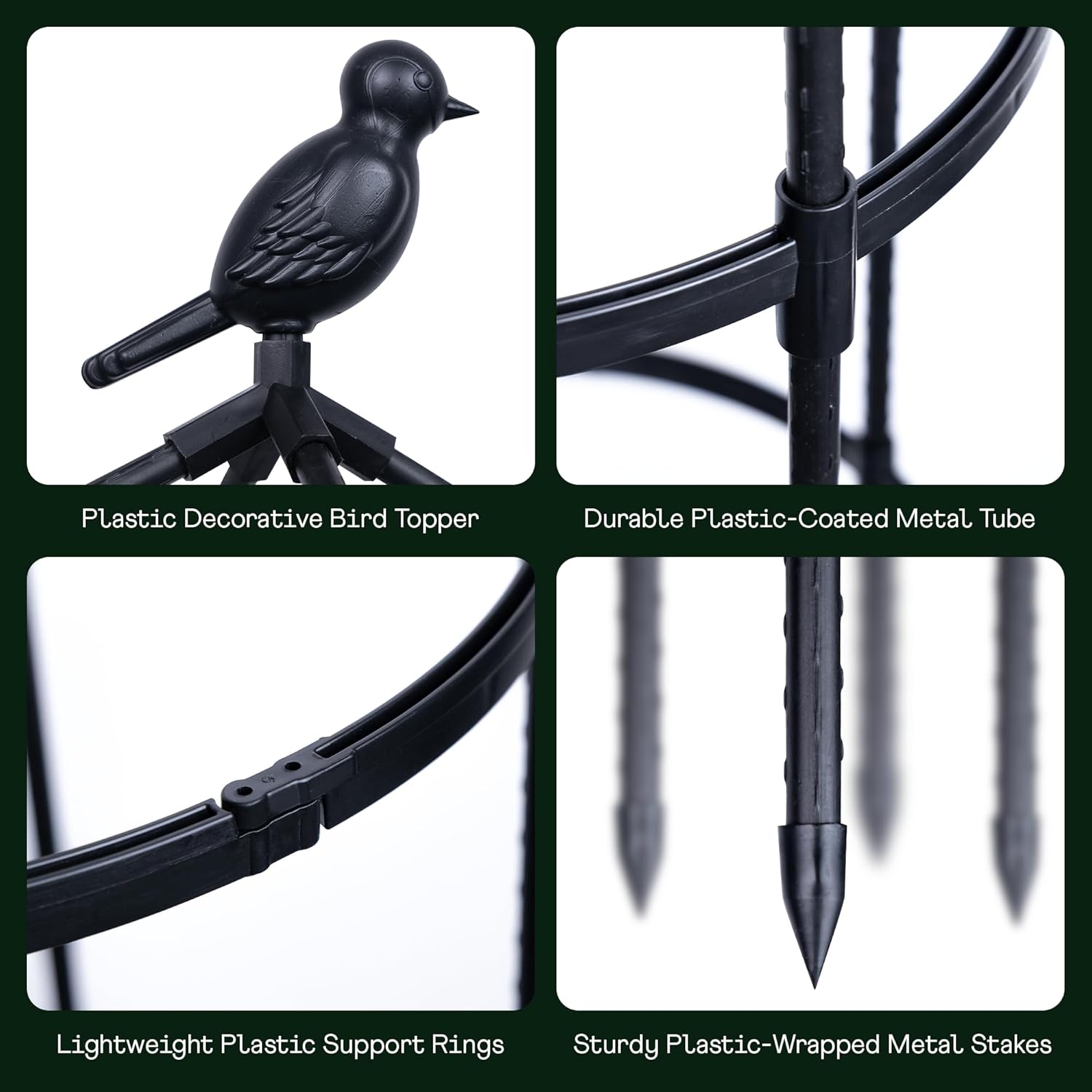 - THE METAL PIPE WITH DURABLE PLASTIC COATING: The garden obelisk trellis metal is made of steel with a long-lasting plastic covering to keep it from rusting. Obelisk trellis with the support plastic rings are made of high-quality plastic.