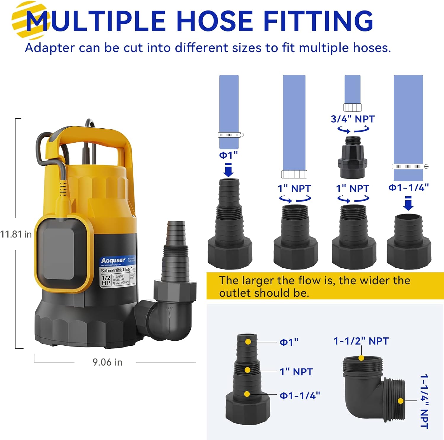 Acquaer 1/2HP Utility Pump 2906GPH Submersible Sump Pump with Automatic Float Switch, Water Removal for Hot Tub, Pools, Basements, Garden Pond