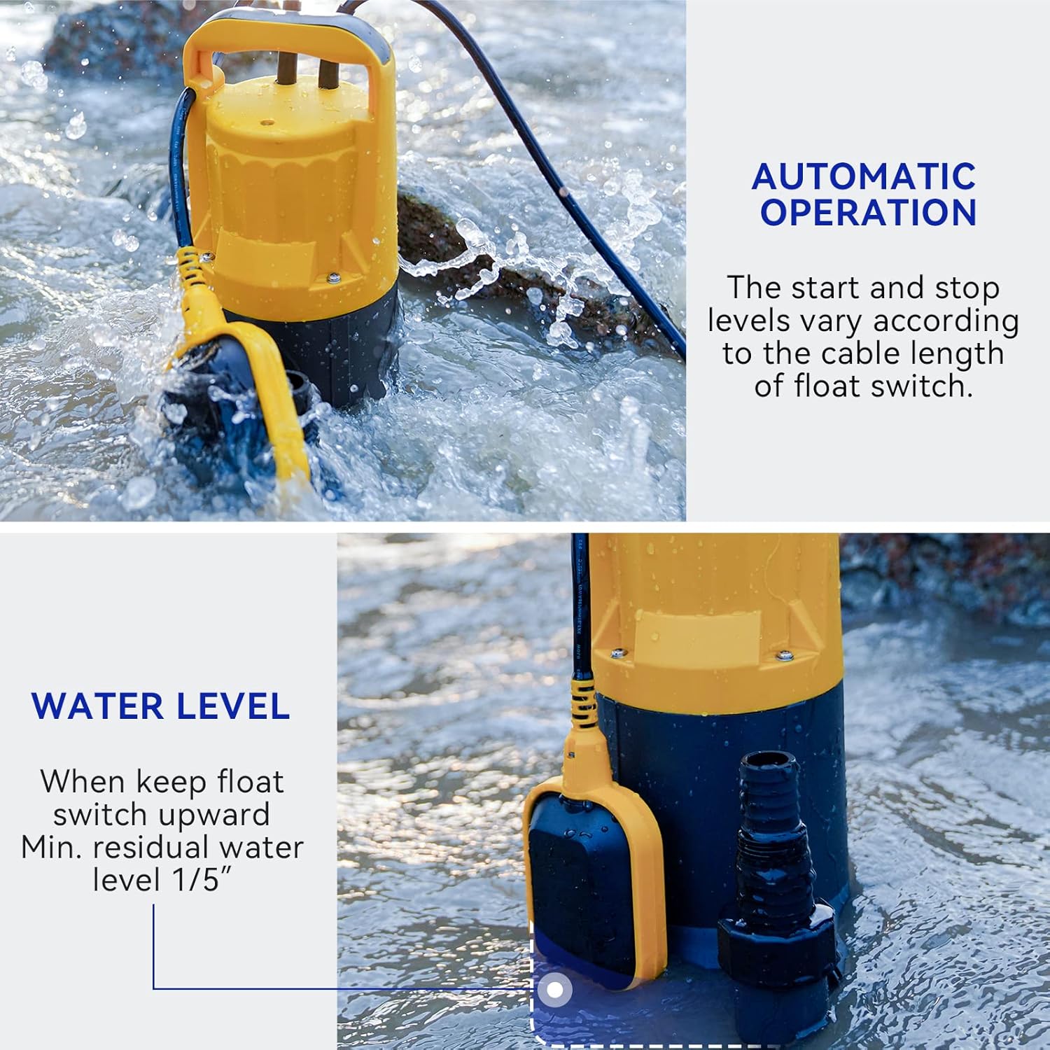 - Auto and Safe Operation: Adjustable float switch turns on/off the pump automatically by the water level. For low water level, keep the switch upward to allow manual operation (plug it in to play; unplug to stop). Low inlet base minimizes residual water in manual mode. 19.7 ft UL power cord provides safety and convenience with max. immersion depth 13 ft