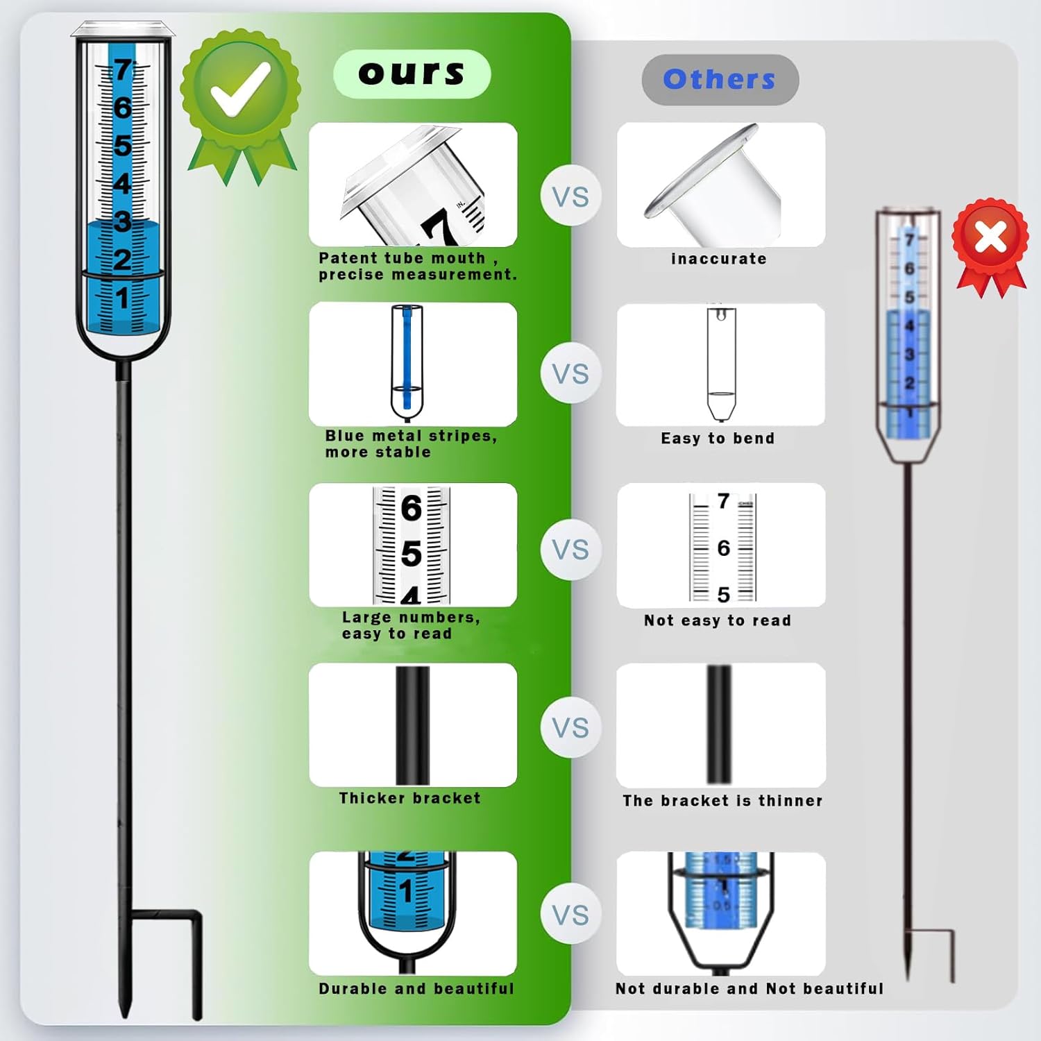 - 【Fashionable and Stable Design】The rain gauge is made of metal stakes, rust-proof and upright. The upgraded rain gauge has two feet ground plug, which can make the rain gauge more stable and will not be affected by high wind. The rain gauge can help you know how much water your plants are watering or how much rain has fallen in your area. It can also be used as a decoration for courtyard, lawn and garden.