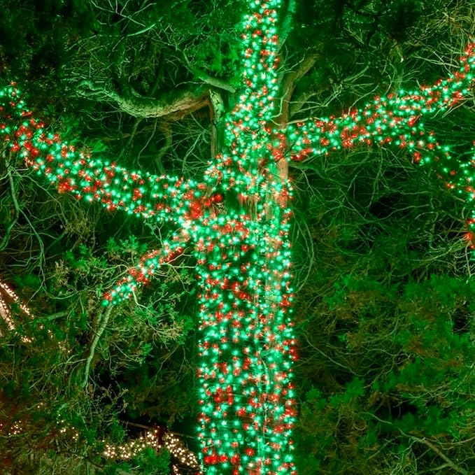 - New Upgraded Red Green Christmas Lights: Red and green two colors in one set,super bright with new upgraded LED bulbs. This extendable 200 LED green wire plug in string lights have 9 lighting modes to satisfy your diverse decorative effect. Total length is 75.8ft, of which 66ft with lights.