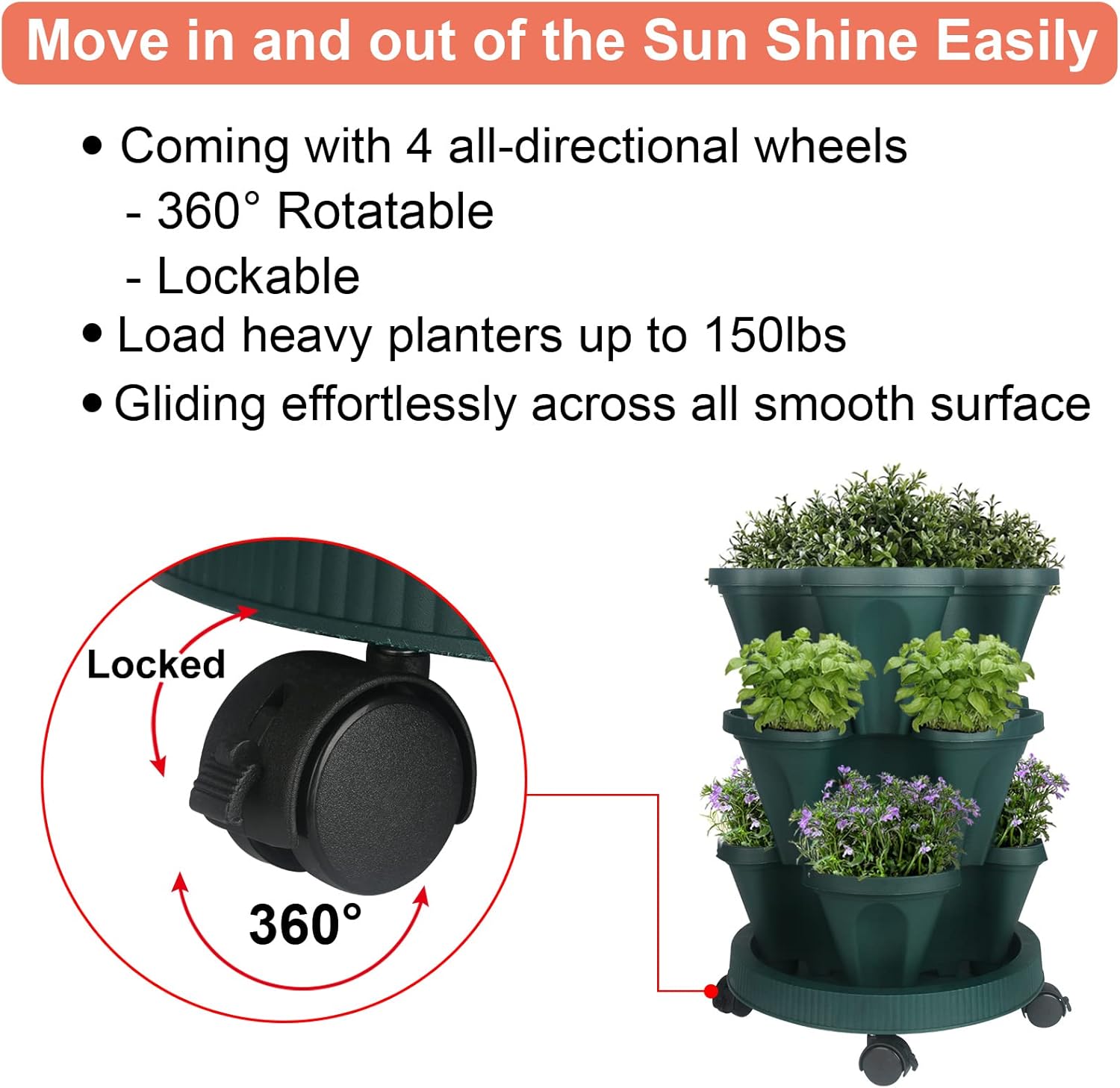 Vertical Planter 3 Tier Stackable Planters Garden Planters Strawberry Herb Flower and Vegetable Planter Indoor Outdoor Gardening Pots with Removable Wheels and Tools