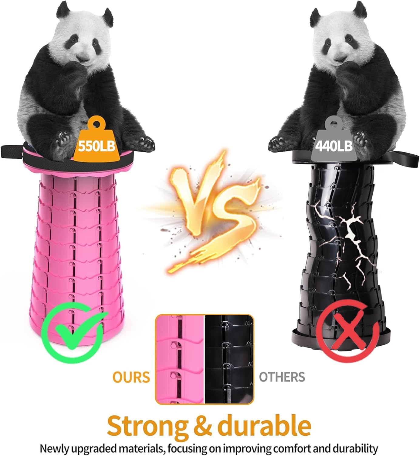 - 【ULTRA STABLE PERFORMANCE】 Upgraded telescoping structure and reinforced clasps give the foldable stool extraordinary stability and rigidity. Our Portable Travel Seat can support up to 550 lbs, far stronger than other similar products. Side support and the capacity of resistance to tilt are also reinforced, which makes the stool more sturdy and durable, ensure safety.