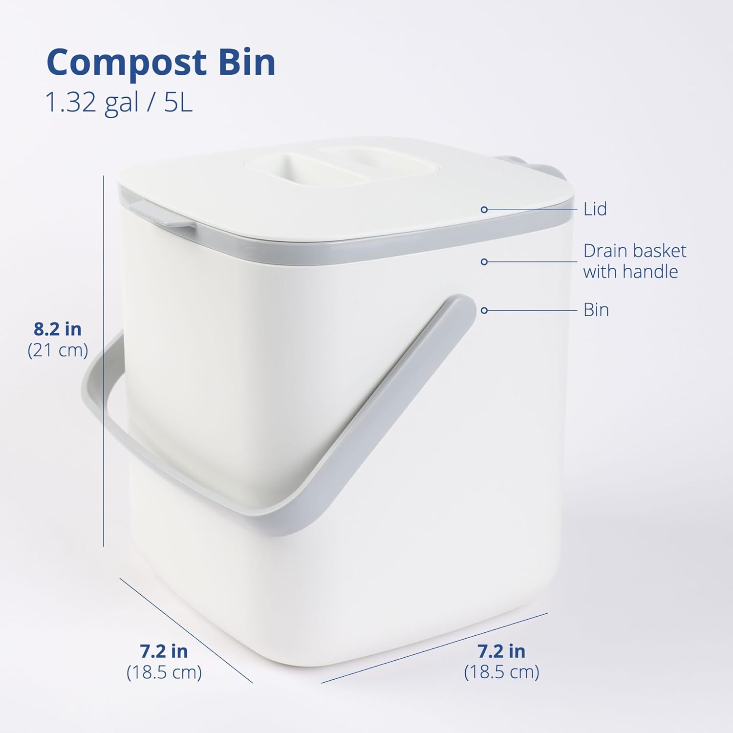 - AVAILABLE IN TWO SIZES - This compost bin is perfect for a 4-person household. It has a capacity of 1.32 gallons or 5 Liters and the outer dimensions measure W7.2 x H8.2 x D7.2 inches.