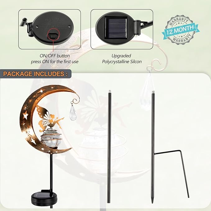 - 🌙【100% Satisfaction & 12-Months Guarantee】Provide one spare stake to come in handy if you need it. Moon solar lights outdoor is great for your porch, garden, pool, solar decor, lawn or yard. If you are not satisfied with the metal fairy solar light, or meet problem with the item, please feel free to contact us, we will reply within 24 hours and we provide 12-month warranty.