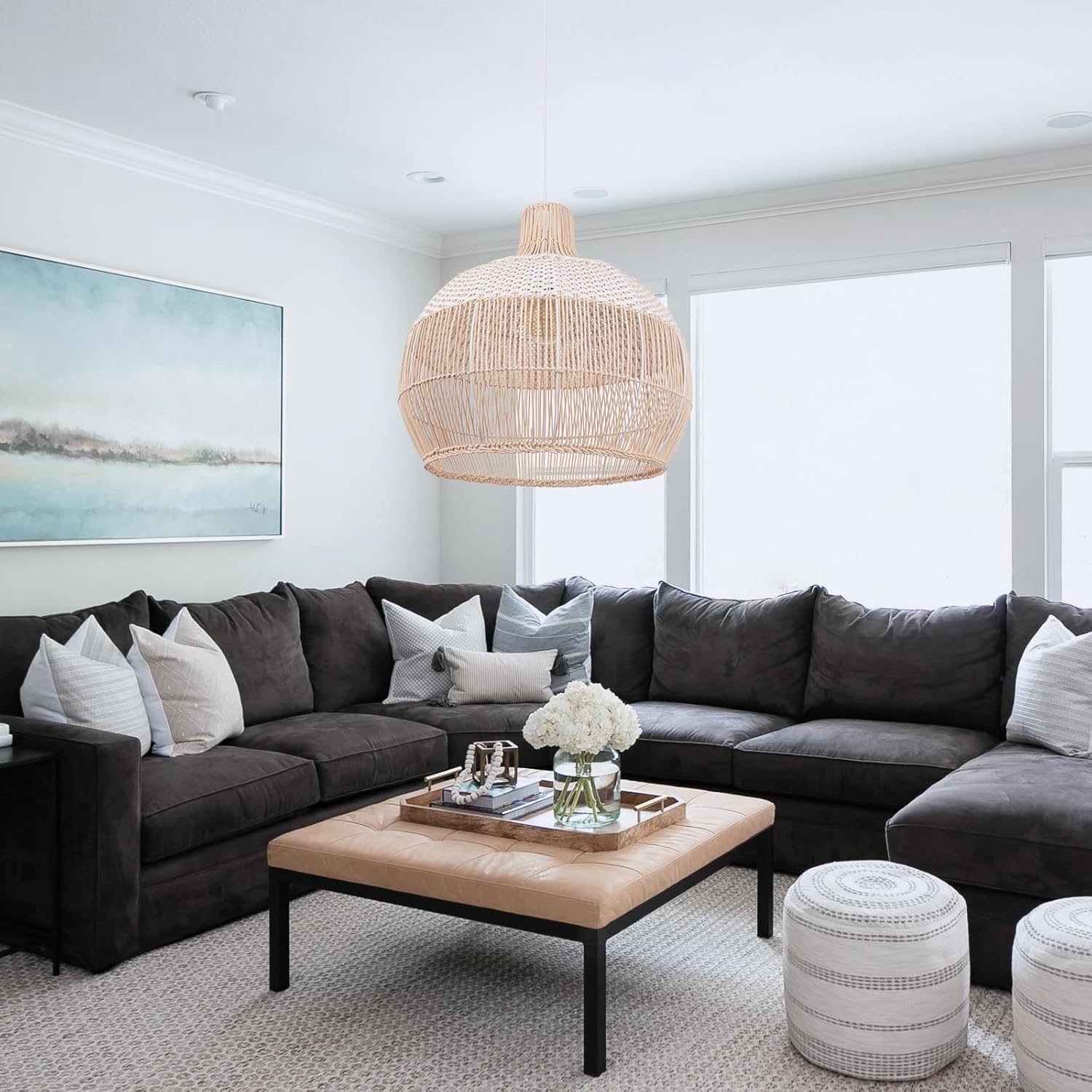 - 【Unique Design】Rustic retro boho coastal style design,chandeliers made of natural rattan and white plastic hand-woven, beautiful and elegant, suitable for a variety of styles.This rattan chandeliers are both a light source and an artistic lamp for your home decoration,which can add elegance to your room.