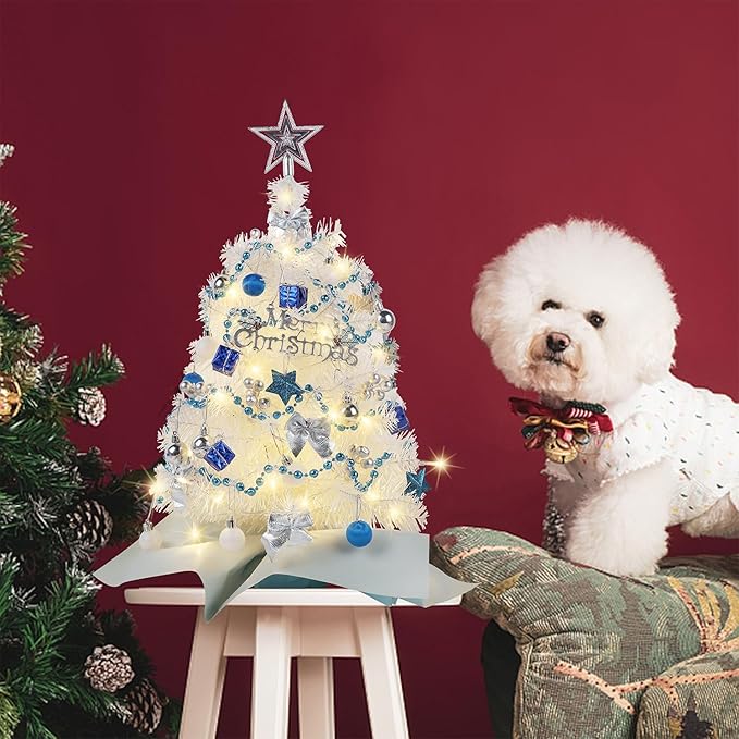 - White Christmas Tabletop Tree: Juegoal 24 Inch/2 FT artificial tree equipped with 75 branch tips, increase the moody and light up your home with this white mini Xmas tree. Giving off a warm white glow, it is a subtle and classy way to bring the magic of Christmas to your home. Easy placement on any surface, Whether placed on a mantel, used as a centerpiece, on a table top, desk or tucked amongst your other holiday decorations