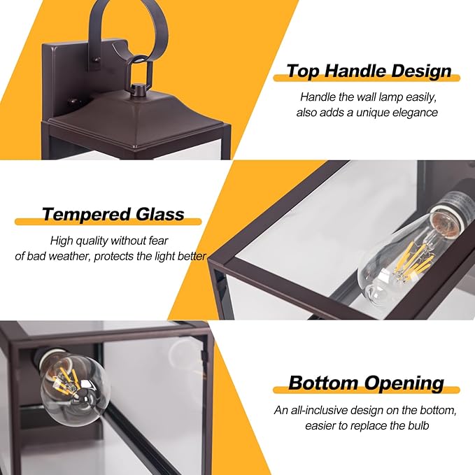- 【Classic & Practical Design】This large orb porch light features 4 clear glass panes, which can emit bright light and illuminate the place at maximum, creating a beautiful lighting atmosphere outside. The design of the top handle makes the oil rubbed bronze outdoor lights lantern look less rigid and adds a modern flair. The outdoor wall light is open at the bottom for easy light cleaning and bulb replacement. The clear lamp shade can showcase your bulb of choice to create a stunning light outside your home.