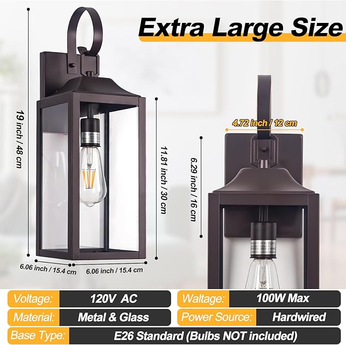 - 【Size & Bulb Compatibility】The bronze outdoor light fixture measures 6 inches in length and width and 19 inches in height. The extra large wall sconce is more economical and can better meet the lighting needs of large spaces. The brown patio wall lantern does not include bulbs. Our exterior wall lamp base is compatible with all E26 bulbs (100W MAX), including LED, CFL, incandescent, dimmable bulbs, etc. The glass shade is pre-assembled and all mounting hardware is included for an easy setup.