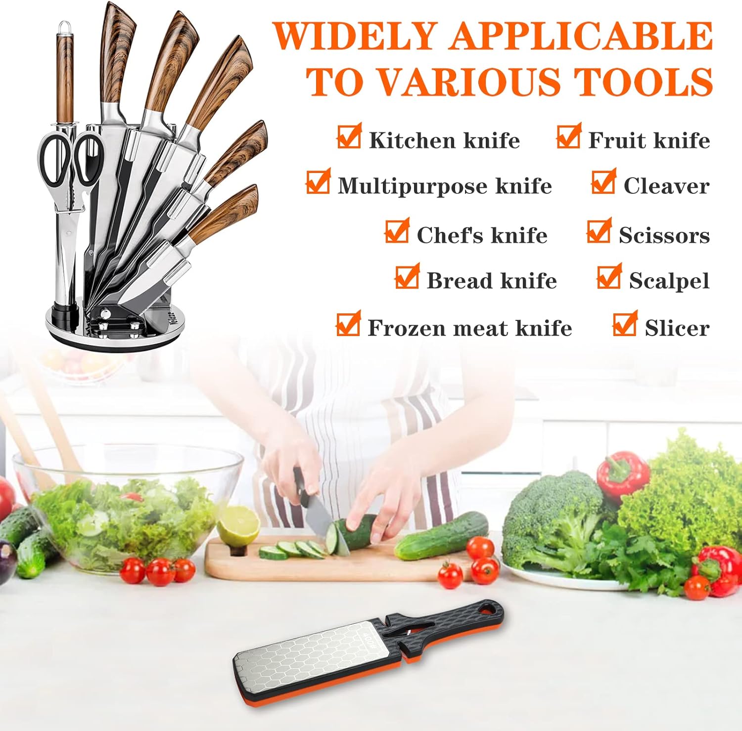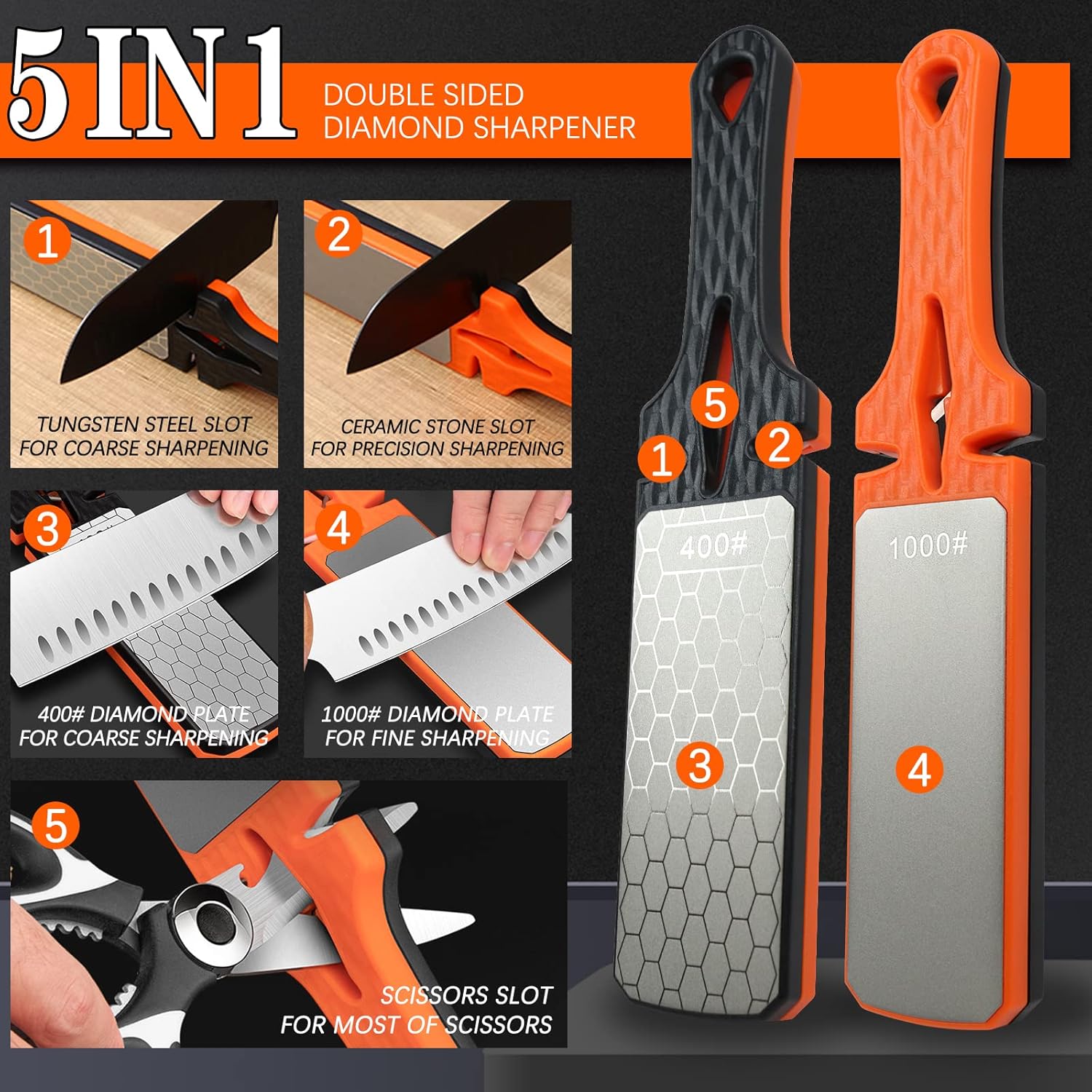 - 5 in 1 Sharpening Stone:The front side 400# coarse sharpening is used to repair severely dulled blades, and back side 1000# fine sharpening is used to re-sharpen the edges and deburr the blade. The lightning slot in middle of handle is for Scissors Grinding.Left waist of the handle is tungsten steel blade sharpens to restore the knife's V-shape,and the right waist of the handle is ceramic blade sharpens for polish and eliminates burrs on the metal blade.