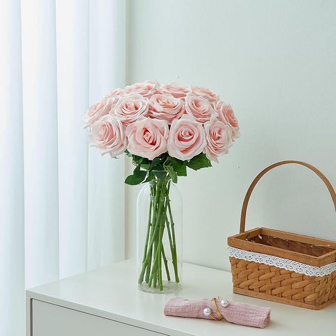 15pcs Blush Roses Artificial Flowers Silk Fake Flowers Realistic Pink Roses Bouquet Long Stemink for Wedding Home Party Birthday Decoration