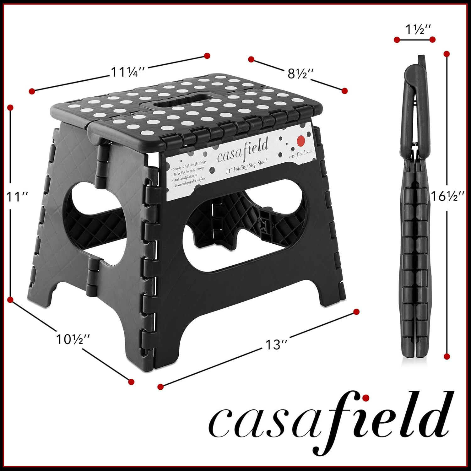 - Textured, grip-dot surface: The unique design of Casafield's folding step stool includes a stylish and textured, grip-dot, no-slip step surface, making this stool safe to use for adults and kids alike. The step surface measures 11.25" W x 8.5" D, providing plenty of footing space.