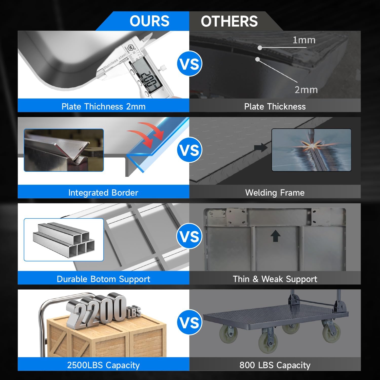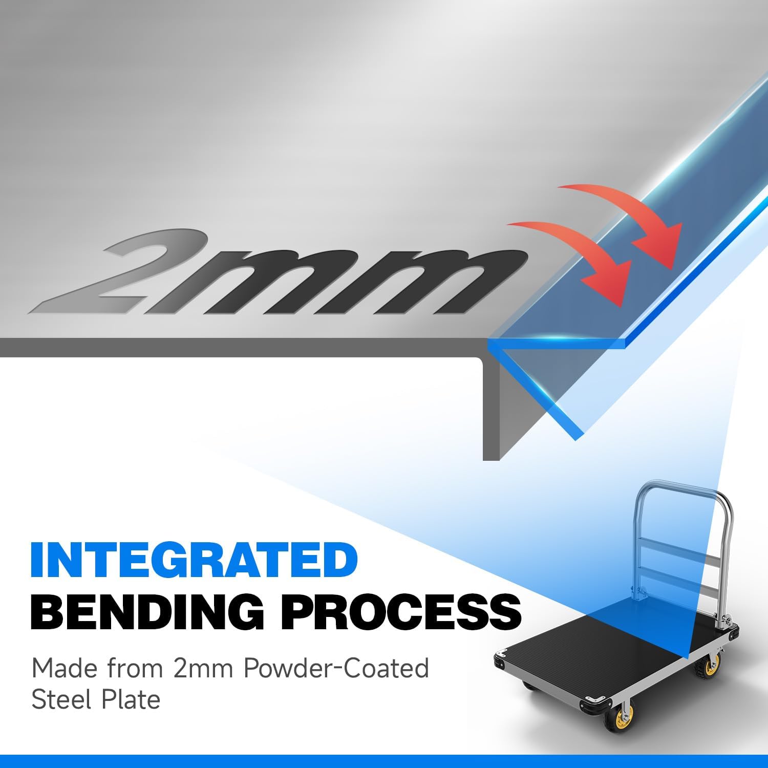 - 2200 LBS Load Capacity: Crafted from robust 2mm thick steel plates, the platform truck's main body employs integral bending for enduring construction that withstands heavy loads and wear. Engineered with a reinforced bottom support, our platform truck ensures even weight distribution, preventing sagging, and reliably carries substantial loads up to 2200 lbs. Count on this cart for dependable performance, whether it's heavy equipment or bulk items.