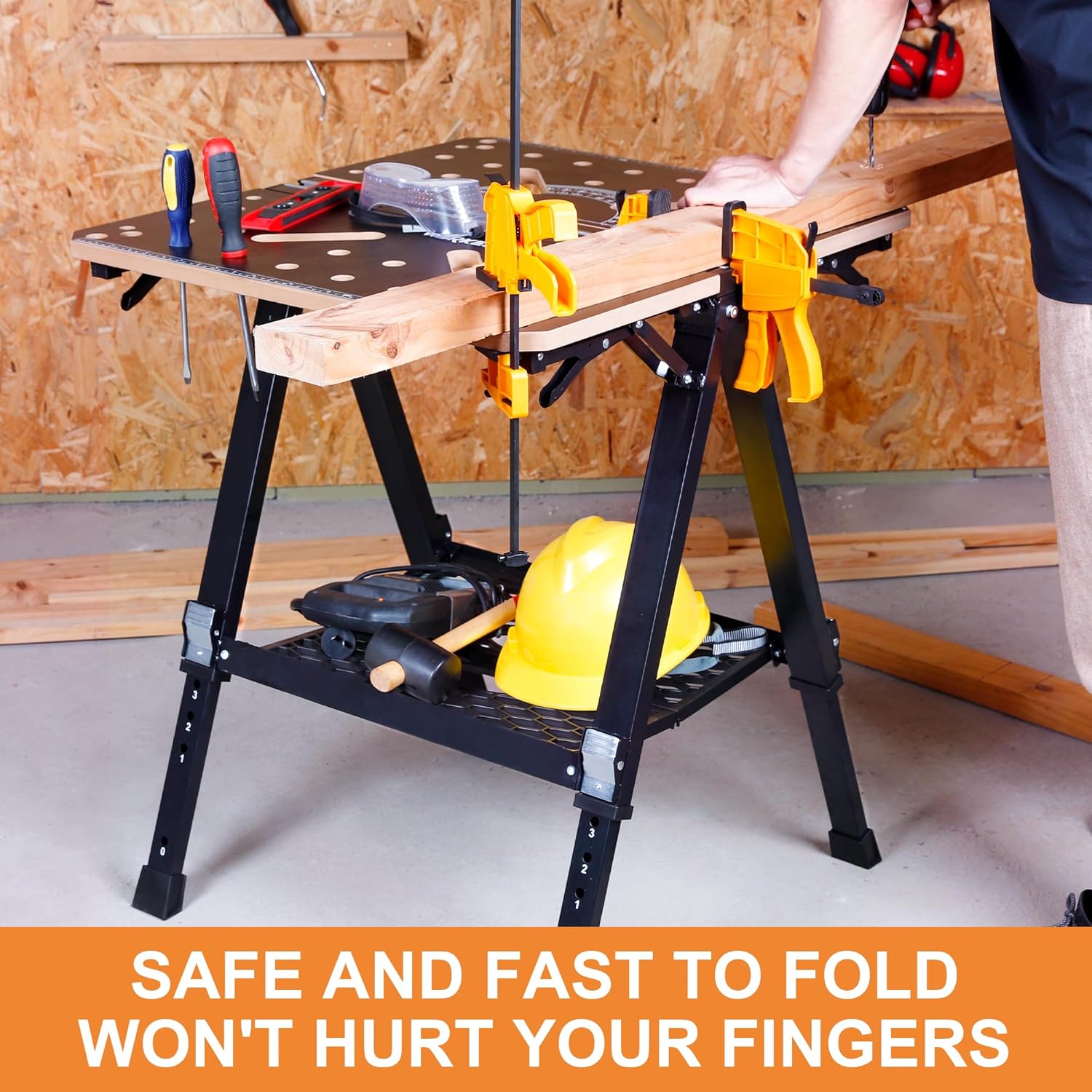 Portable Workbench & Sawhorse, 1000Lbs Capacity Heavy Duty Folding Work Table, 23.6"-36" Adjustable Height with 2 Quick Clamps, 4 Bench Dogs, 2 x 4 Support Arms for Garage