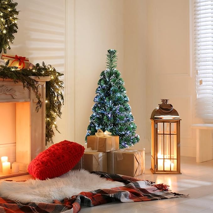 HAPPYGRILL 3FT Fiber Optic Christmas Tree Pre-Lit Artificial Christmas Tree with 85 PVC Tips, Green Xmas Tree with LED Lights for Indoor Outdoor Festival