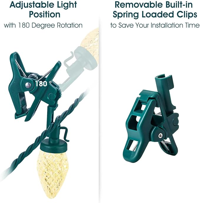 - Convenient Firm Setup and Removeable Quick Clips: These energy efficient C9 LED Christmas lights feature spring-loaded clips that provide a convenient and firm setup. Compared with ordinary clips, the spring-loaded clips can more firmly and securely fastening the lights to various surfaces such as roofs, railings, or trees. The clips can also be easily removed if needed. Perfect for outdoor use
