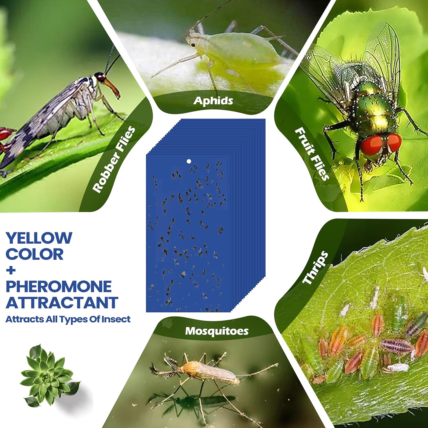 - Double Sided Stickiness: our blue sticky traps are designed to be double sided, widely capture the most pests, includes white flies, leaf miners, fungus gnats, shore flies, midges, mosquitoes, and other flying insects, you can place them in the garden, lawn, yard, next to the trash can and so on