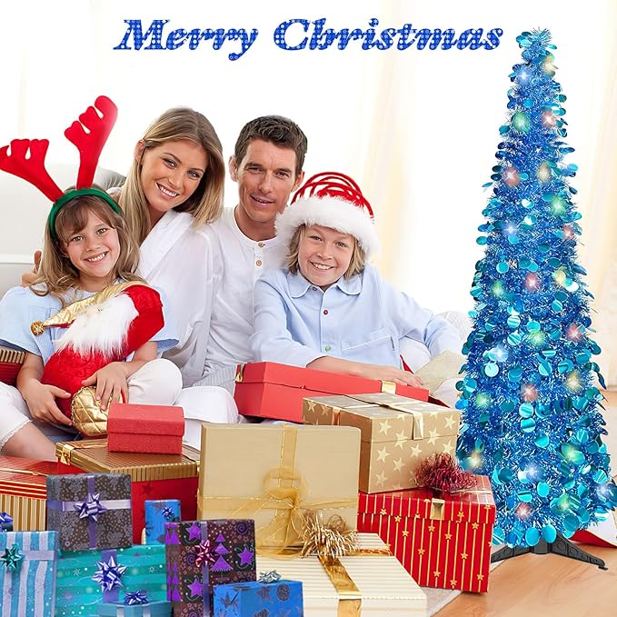 5 FT Pencil Christmas Tree, Collapsible Artificial Sequin Pop Up Christmas Tree, Skinny Pencil Tinsel Christmas Trees, Xmas Tree for Home Apartment Basement Fireplace (Pure Blue)