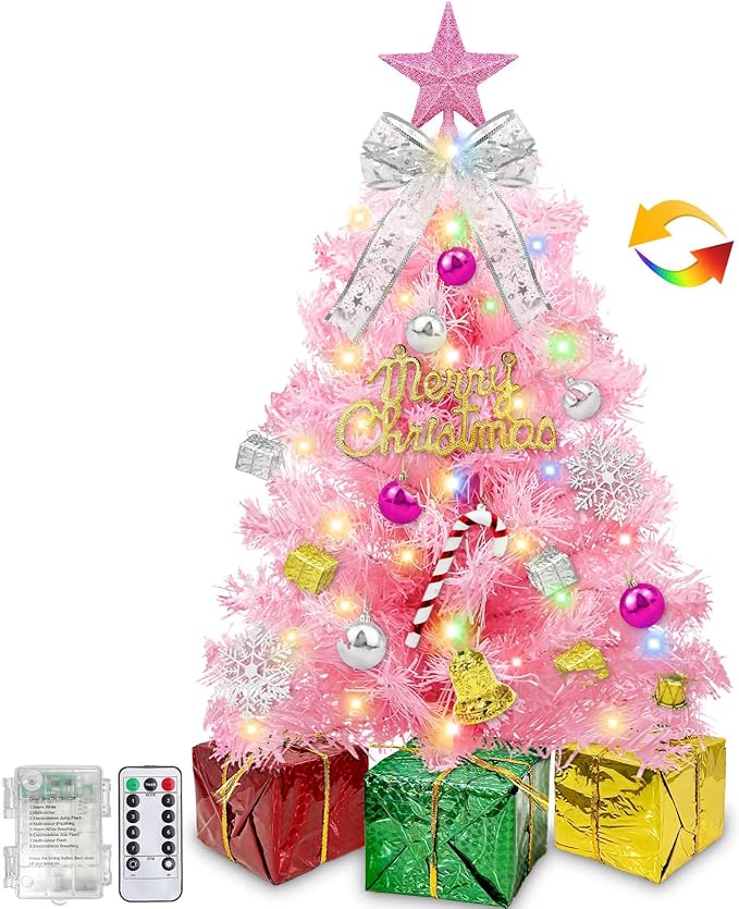 Dual Color Change&Remote Control-24 Inch/2FT Pink Small Christmas Tree with Lights Timer,Warm White&Colored Changing Lights Orantments Gift Boxes 8 Modes Mini Tabletop Christmas Tree Indoor Home Decor