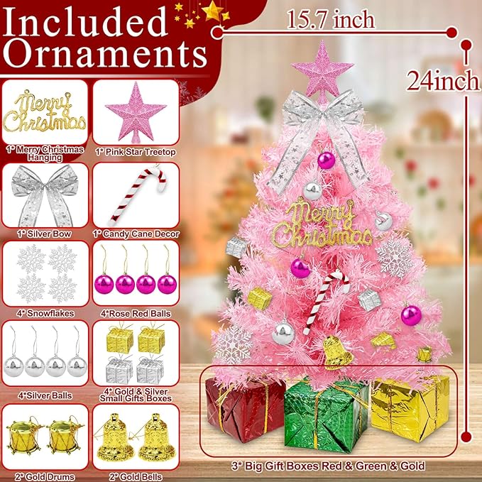 - 24 Inch Tabletop Pink Christmas Tree: 2ft Mini Christmas tree with 27 Xmas Ornaments (1*Merry Christmas Sign, 1*Pink Topper Star, 8*Valentines balls, 1*Bow, 1*Candy Cane, 4*Snowflakes, 7*Gifts Boxes, 2*drum, 2*Bell), Szie: 24 inch(h)*15.7inch(w)
