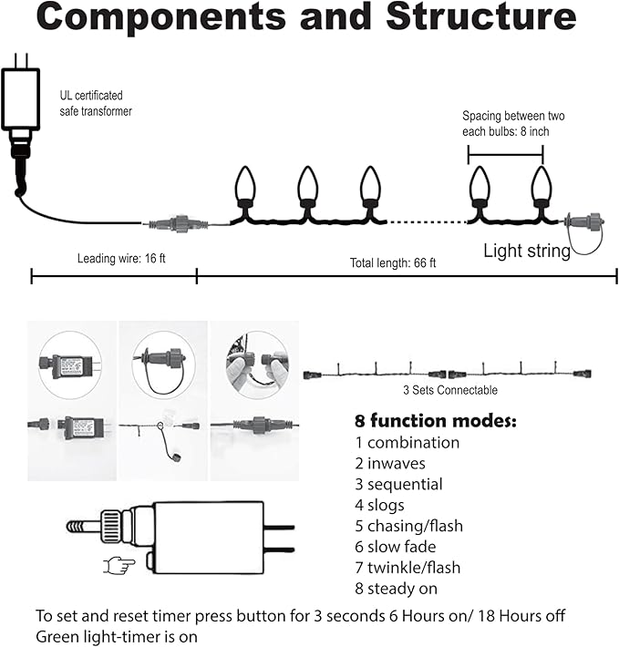 - 8 MODES WITH TIMER: This C9 Christmas string lights offer 8 distinctive lighting modes, including a combination, wave, sequential, slow glow, chasing/flash, slow fade, twinkle/flash, and steady on.(NOTE:Long-time press the button on the adapter, when shows green lights, timer works.)