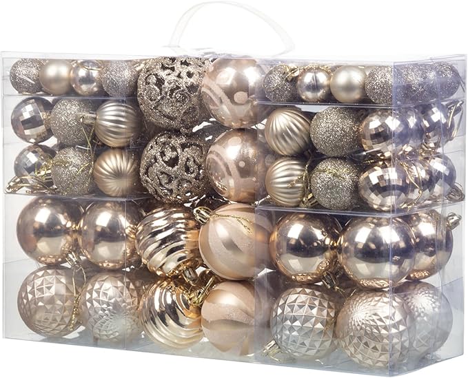 100PCS Christmas Ball Ornaments, Assorted Shatterproof Christmas Tree Decorations, Seasonal Decorative Hanging Baubles Decor Set for Xmas/Holiday/Party, Glitter&Painting Ornament Set (Champagne)