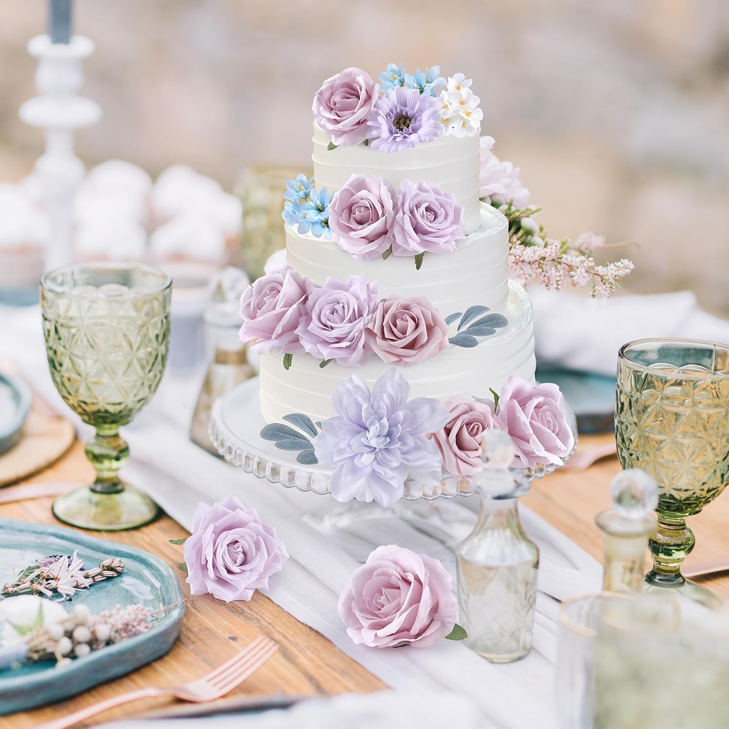 - Roses Artificial Flowers Set: This fake flowers set box consists of different types and colors of fake flowers. Handmade roses artificial flowers come with flower stems. These purple roses artificial flowers for decoration can be used as wedding shower decorations, floral arrangement, wedding centerpieces for tables, baby shower home decorations