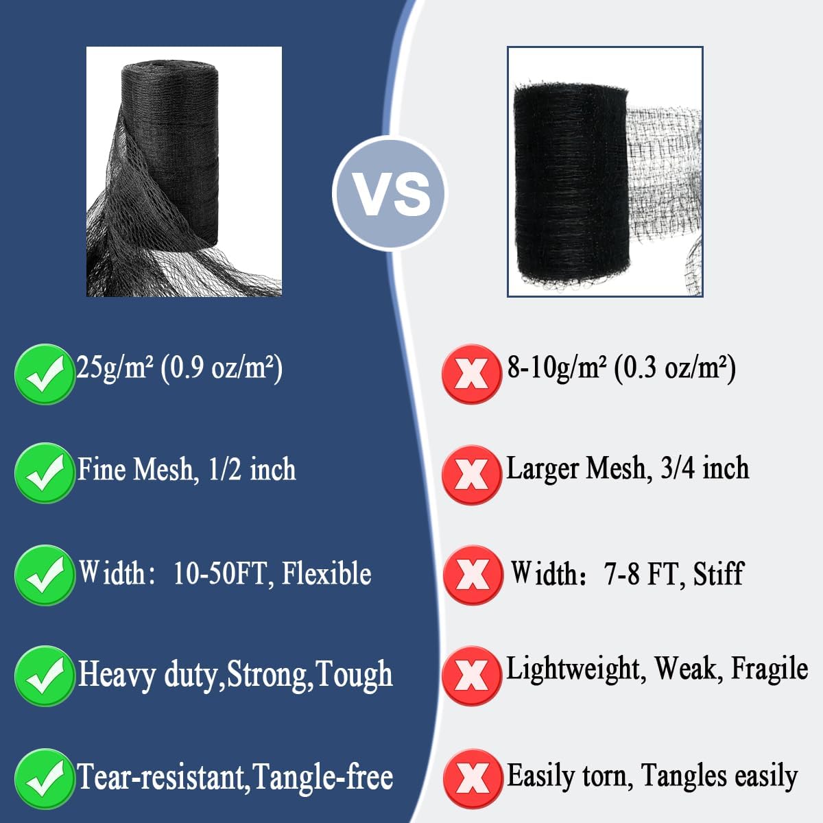 - Durable & Reusable: Our heavy duty bird net is made using a woven technique and weighs 0.9 oz/m² (25g/m²), significantly stronger than traditional lightweight deer netting, which weighs only 0.2-0.4oz/ft² (6-10g/m²) and is thin and fragile. The bird netting for plants is resistant to extreme cold and heat changes, corrosion-resistant, aging-resistant, Can withstand strong winds, storms, snow, ice, and other harsh conditions, making it durable enough for repeated use across multiple seasons.