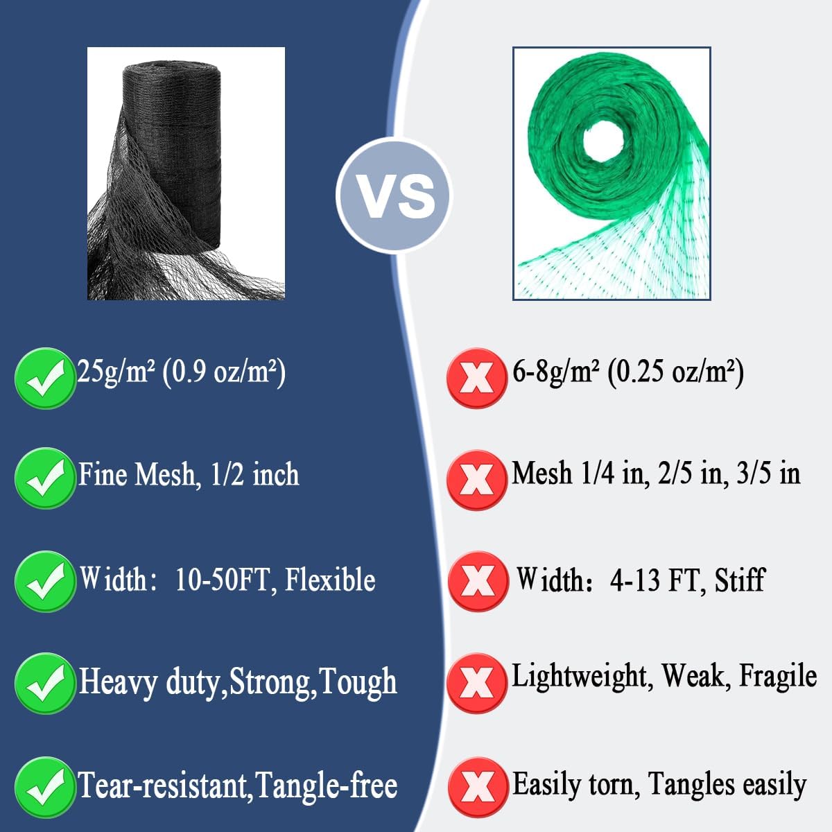 - 1/2 In mesh size: The mesh holes small enough for birds, even the smallest hummingbirds, it allow water and sunlight to reach plants, do not harm plants or obstruct their growth. Additionally, Its tight fine mesh design also prevents birds, small animals, pets from getting tangled in the netting material, keeping them safe while protecting your garden. Our strong woven bird netting easy unfold, won't tear and tangled, with a load-bearing capacity exceeding 100 pounds.