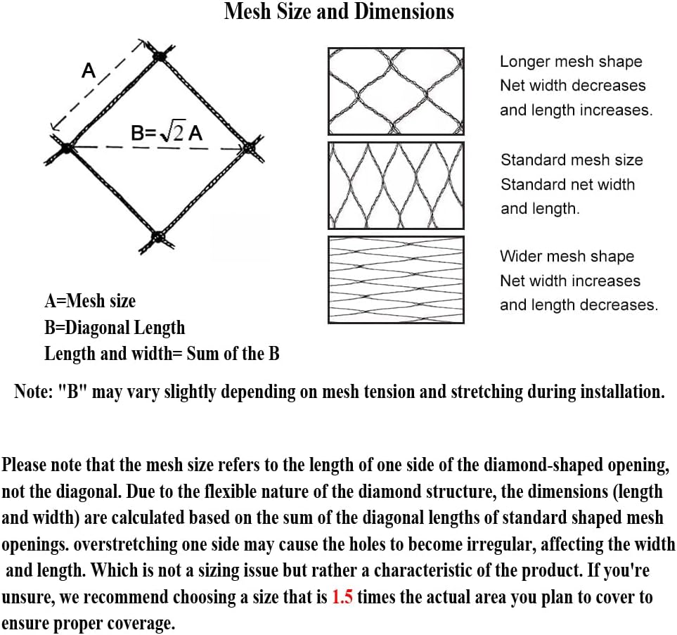 - Notice: The bird netting roll can be cut to any size you need for your garden, orchard, farmland or poultry fencing. The product size refers to the dimensions when the bird netting is evenly stretched. Since the mesh is diamond-shaped, overstretching one side may cause the holes to become irregular, affecting the width and length. which is not a sizing issue but rather a characteristic of the product. Please adjust according to your needs.