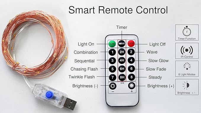 - REMOTE CONTROL WITH TIMER & MODES – Handy remote lets you switch the lights on/off, choose light effects (steady, slow fade, twinkle, etc.), and set timer options; remote uses a small coin-cell battery CR2025 (not included); please keep coin batteries out of reach of children;