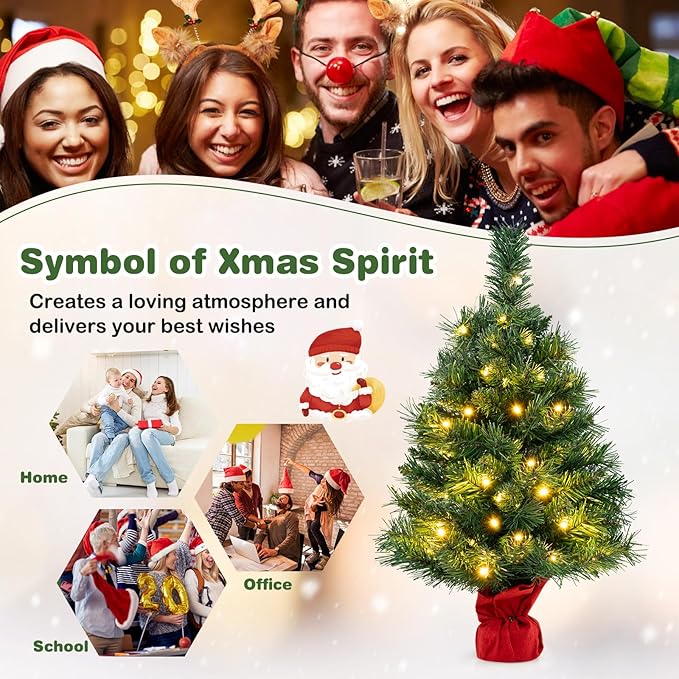 HAPPYGRILL 2FT Small Prelit Christmas Tree, Mini Tabletop Battery Operated Artificial Xmas Tree w/35 LED Lights, 71 Tips & Solid Cement Base, Christmas Spruce Fir Decoration for Fireplace Home Office