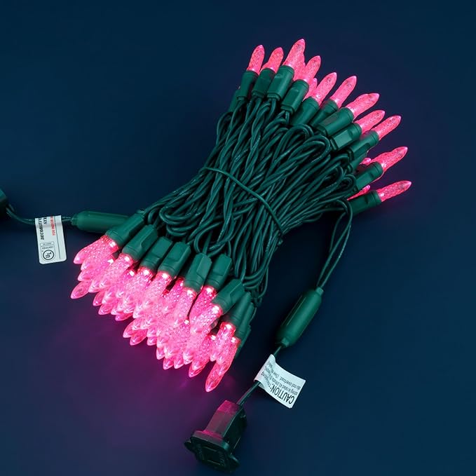 100 Pink Faceted One-Piece LED Christmas Lights, 33 ft Green Cord High Waterproof UL Certified M6 Outdoor String Lights (Pink)