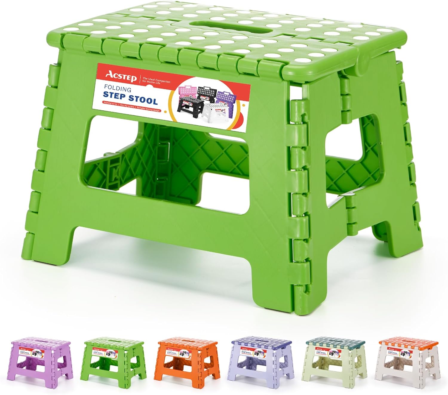 ACSTEP 9 Inch Folding Step Stool 300 LB Capacity Plastic Foldable Step Stools for Kids and Adults, Folding Stool Suitable for Kitchen, Stepping Stool with Handle Green Small Step Stool 1PC