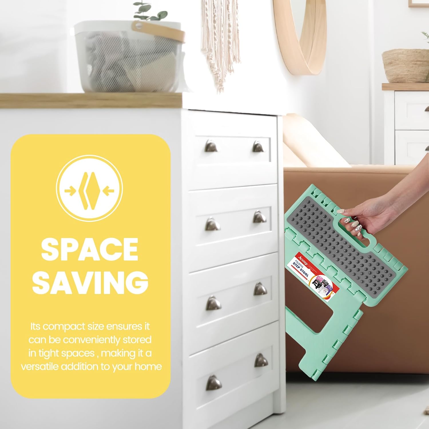 - Perfect Size: Featuring a perfect 9-inch height, ACSTEP folding step stool provides the ideal elevation to reach high shelves, cabinets, or any other areas that are out of reach.