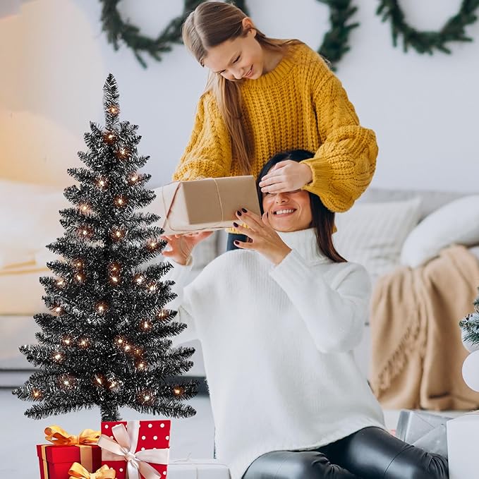 - Lifelike Black Christmas Tree: Featuring realistic PVC branch tips, this 4ft black Christmas tree for a full and natural appearance. The lights emitted a charming glow. The 4 feet Christmas tree has enough space, decorate freely.