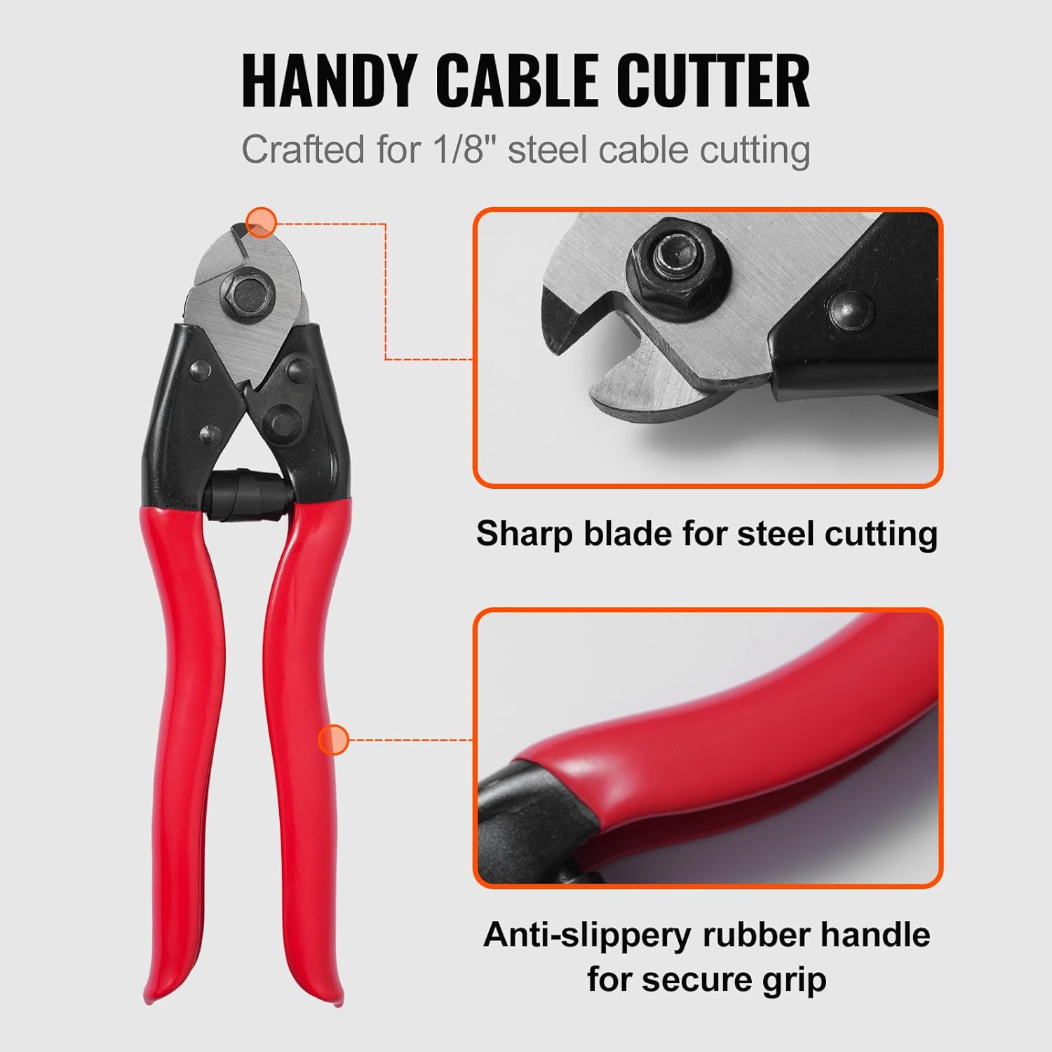 - Cable Cutter Kit: VEVOR aircraft cable comes with the 300 ft cable and a cable cutter that cuts up to 1/8" diameter rope. It works flawlessly for cable-length cutting and leaves a clean wound on the cable. Anti-slippery rubber grip works for a safer operation.