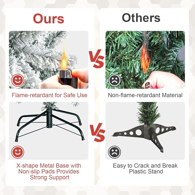 - [Sturdy and Durable Metal Stand] The snow-flocked tree comes with an X-shaped iron stand that ensures stability and keeps the tree upright throughout the season. Compared to plastic bases, the metal stand offers enhanced stability and durability, providing strong support year-round. Additionally, the sturdy metal stand is foldable for convenient storage.