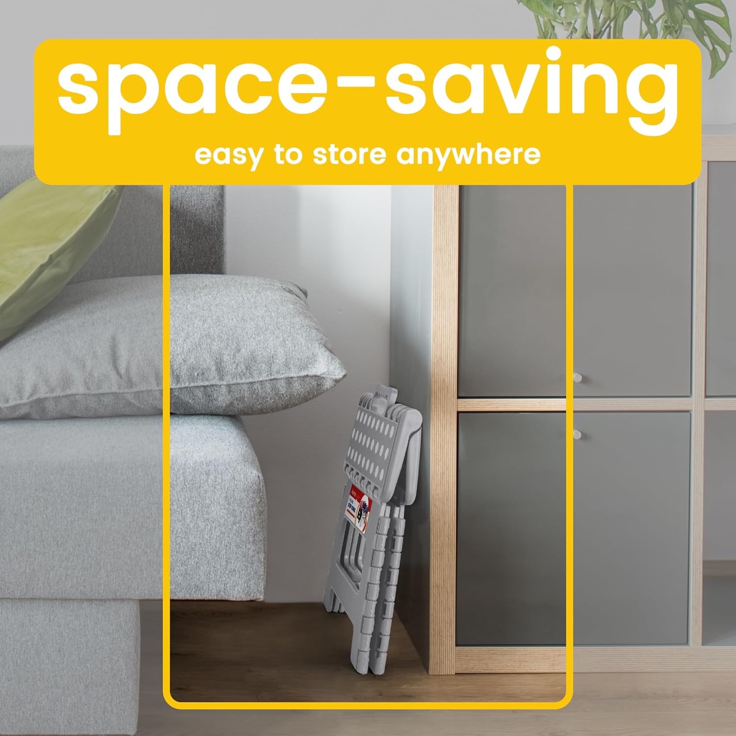 - Space Saving & Portable: Folded to only 1.7" wide, easy to store in corners of bathrooms, kitchens, bedrooms, etc. to keep your home organized. The foldable step stool opens and closes easily with just one hand, and can bring it with you for going out.