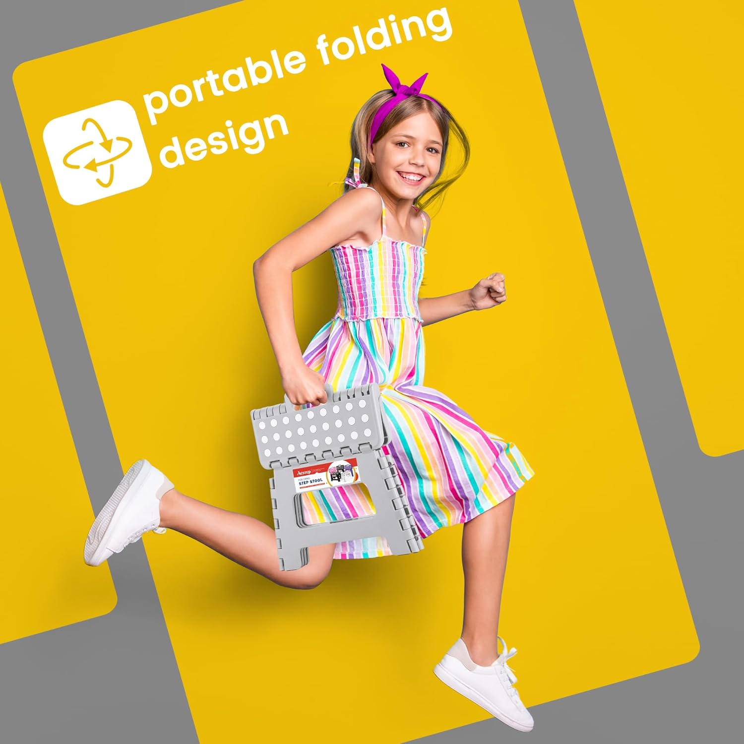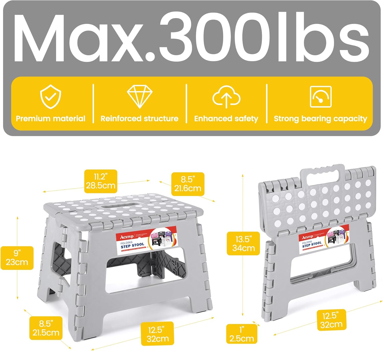 ACSTEP Folding Step Stool 9'' Foldable Step Stool for Kids and Adults Up to 300 lbs, Non-Slip Folding Stools with Portable Handle for Bedroom Kitchen, Bathroom Grey