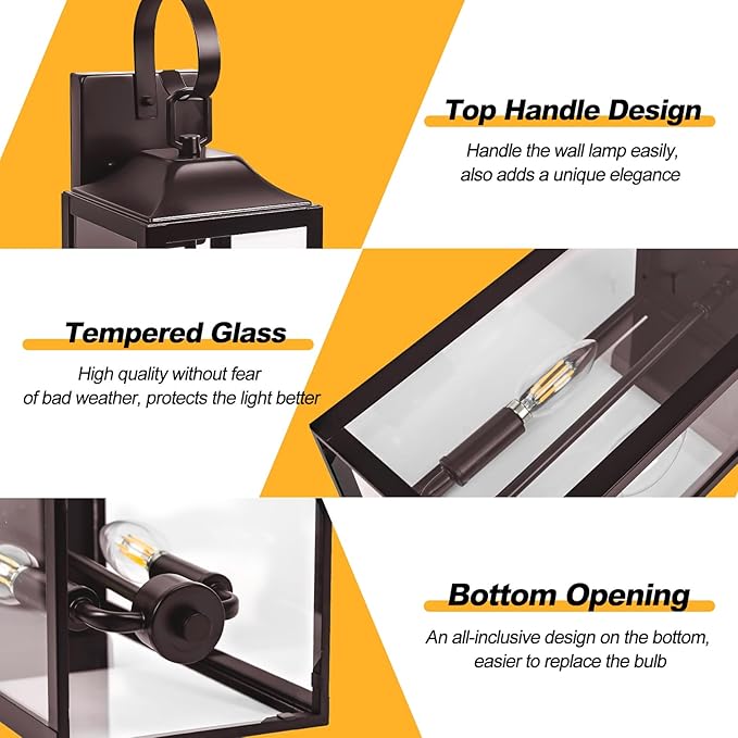 - ๐๐ฅ๐๐ฌ๐ฌ๐ข๐ & ๐๐ซ๐๐๐ญ๐ข๐๐๐ฅ ๐๐๐ฌ๐ข๐ ๐ง: This large porch light features 4 clear glass panes, which can emit bright light and illuminate the place at maximum, creating a beautiful lighting atmosphere outside or inside your home. The design of the top handle makes wall light fixture look less rigid and add a modern flair. The outdoor wall light is open at the bottom for easy light cleaning and bulb replacement. The clear lamp shade can showcase your bulb of choice to create a stunning light outside your home.