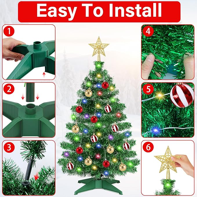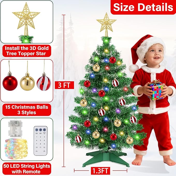 [ Timer & 12 Modes ] 3 Ft Green Christmas Tree with DIY 50 Warm White & Multi Color Lights 15 Ball Ornaments 3D Star Remote Control Battery Operated Pencil Full Tree Xmas Christmas Decorations Table