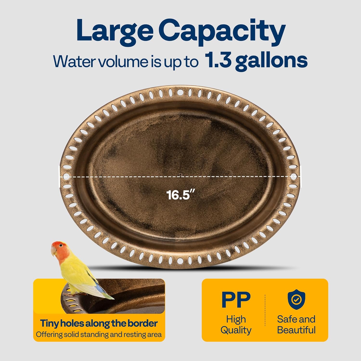 - LARGE CAPACITY - This extra-large bird bath features an oval tray with tiny holes along the border, offering a solid standing and resting area for your feathered companions; The bird bath has a capacity of 1.3 gallons and a diameter of 16.5 inches, which will hold enough water or food for your wonderful avians and butterflies to enjoy, and a depth of 3.5 inches is sufficient to accommodate a solar fountain pump or a bird bath deicer (Bowl dimension: 16.5β LΓ12.6β W, bowl depth: 3.5 inches)