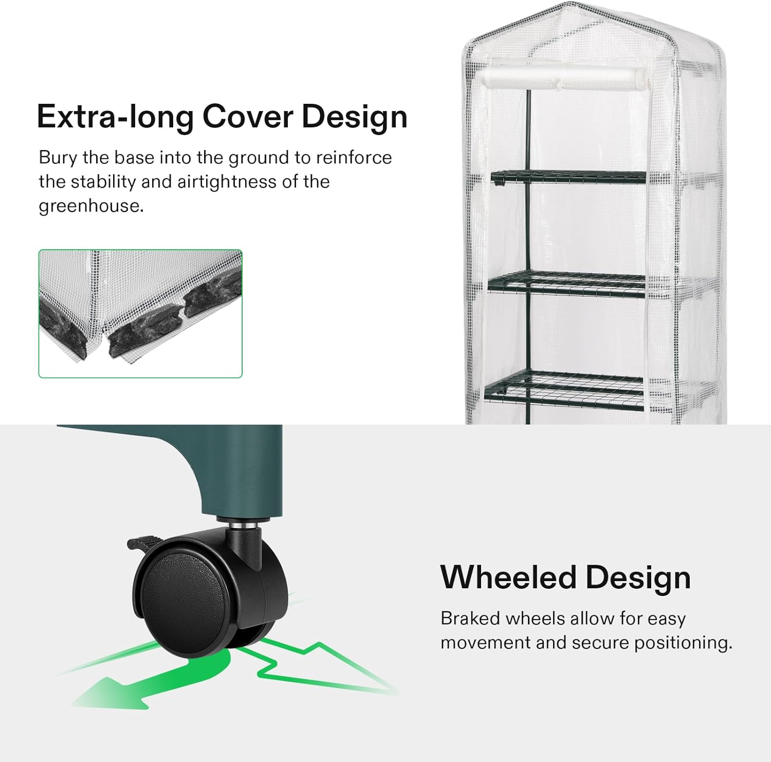 VIVOSUN Mini 4-Tier Greenhouse with Wheels, 27 x 19 x 63-Inch Reusable Portable Warm House with White PE Cover and Shelf for Compact Garden and Small Backyards, with Wheels