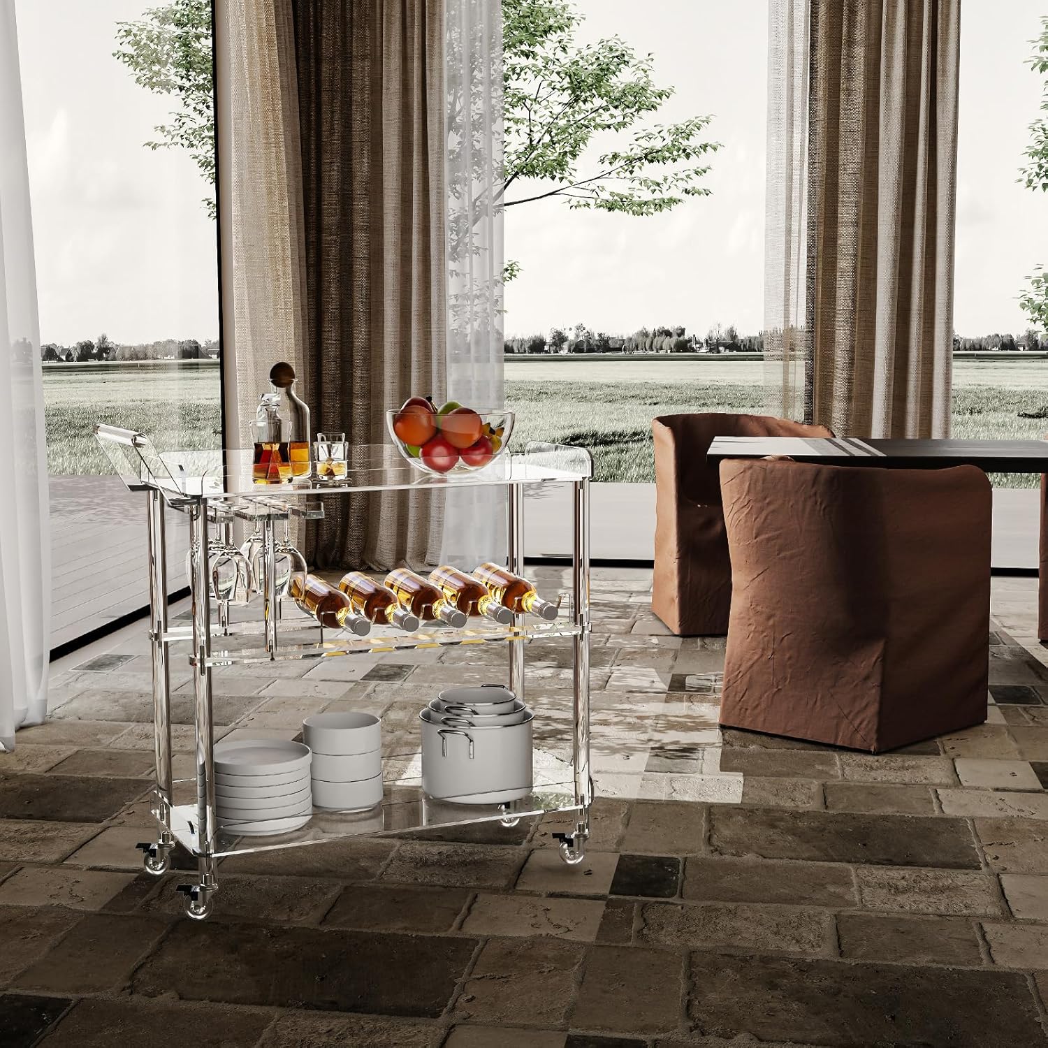 HMYHUM Acrylic Bar Cart with 4 Lockable Wheels, Clear Serving Cart with Wine Rack and Glass Holder, Rolling Beverage Cart for Home, Kitchen, Dinning Room, 33.7" L x 13" W x 34.8" H