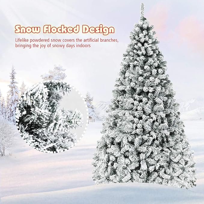 - [Premium PVC Needles for a Realistic Look]: The Christmas tree is crafted from high-quality PVC and boasts 1498 dense branch tips, offering the same durability and safety as a real tree. The charming flocked snow leaves add a touch of realism, creating the appearance of a tree dusted with snow. The lush green branches also provide ample space for you to showcase your favorite decorations.