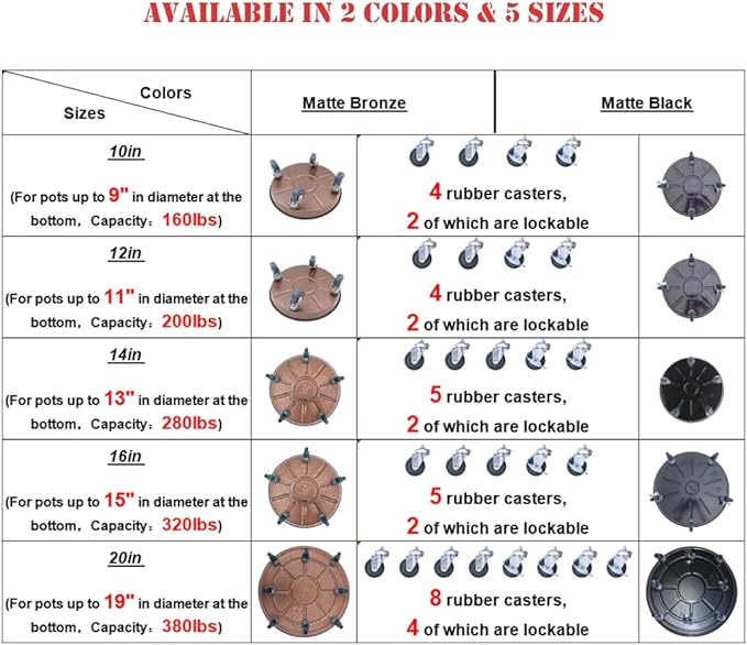 - 【Bronze 20inches】 This plant saucer with wheels is suitable for large pots with a base diameter of 14 to 19 inches and can hold up to 380lbs. The depth of the tray is about 1.8inch and there are no drainage holes,so it can catch and hold the overflow to prevent your floor from getting wet.