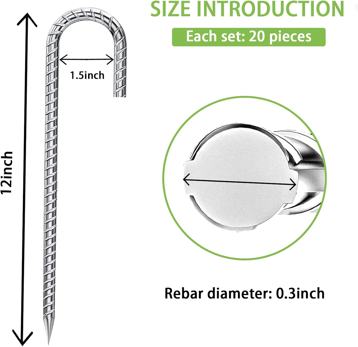 Rebar-Stakes-12-Inch, Ground Stakes Heavy Duty for High Winds Galvanized Anti-Rust J Hook 20pcs Metal Stakes for Ground Heavy Duty Ground Anchors for Garden Dog Fence Chicken Coop Water Pipe