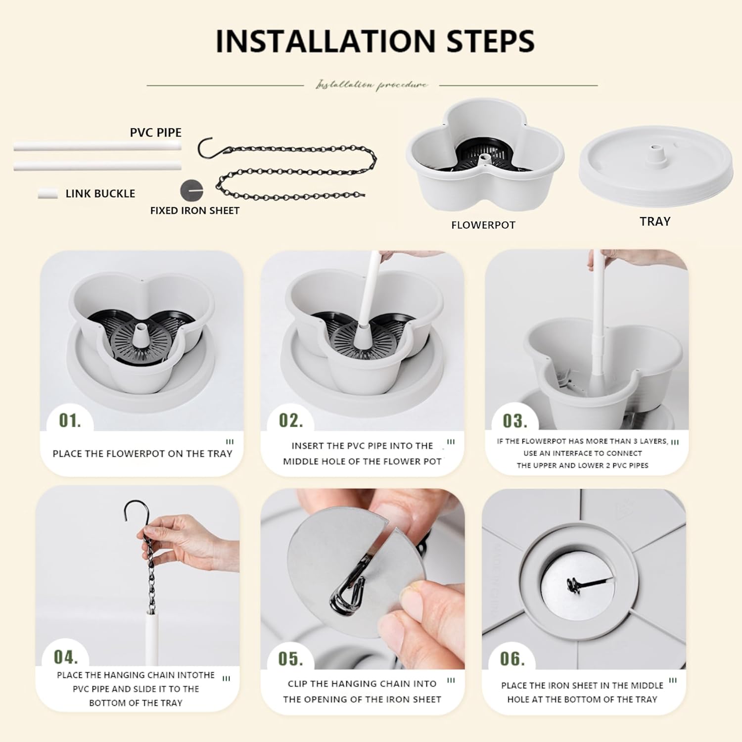 • Simplified Gardening: Each pod is 13 x 5.1 Inch (LXH), and the tray height is 3.54 Inch(H), filter tray is 12 Inch, and total height is 2.52 FT(H), iron chain is 37.5 inch.This planter allows for versatile stacking options: 2, 3, or even 4 tiers high. Additionally, it can be suspended using chains or positioned on a cylindrical pole.