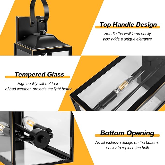 - ๐๐ฅ๐๐ฌ๐ฌ๐ข๐ & ๐๐ซ๐๐๐ญ๐ข๐๐๐ฅ ๐๐๐ฌ๐ข๐ ๐ง: This large porch light features 4 clear glass panes, which can emit bright light and illuminate the place at maximum, creating a beautiful lighting atmosphere outside or inside your home. The design of the top handle makes wall light fixture look less rigid and add a modern flair. The outdoor wall light is open at the bottom for easy light cleaning and bulb replacement. The clear lamp shade can showcase your bulb of choice to create a stunning light outside your home.